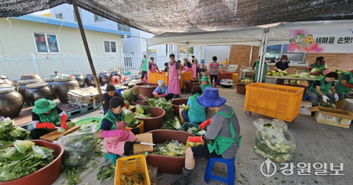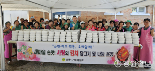 화천군새마을회(회장:이선국)는 11일 새마을회관에서 사랑의 김치 담그기 봉사활동을 통해 지역주민 350가구에 전달했다. 이날 김치 담그기 봉사활동에는 최문순 군수 부인 김연옥씨를 비롯해 김경이 군여성단체협의회장, 나병학 전 군새마을회장 등 40여 명이 참여했다.화천군새마을회(회장:이선국)는 11일 새마을회관에서 사랑의 김치 담그기 봉사활동을 통해 지역주민 350가구에 전달했다. 이날 김치 담그기 봉사활동에는 최문순 군수 부인 김연옥씨를 비롯해 김경이 군여성단체협의회장, 나병학 전 군새마을회장 등 40여 명이 참여했다.